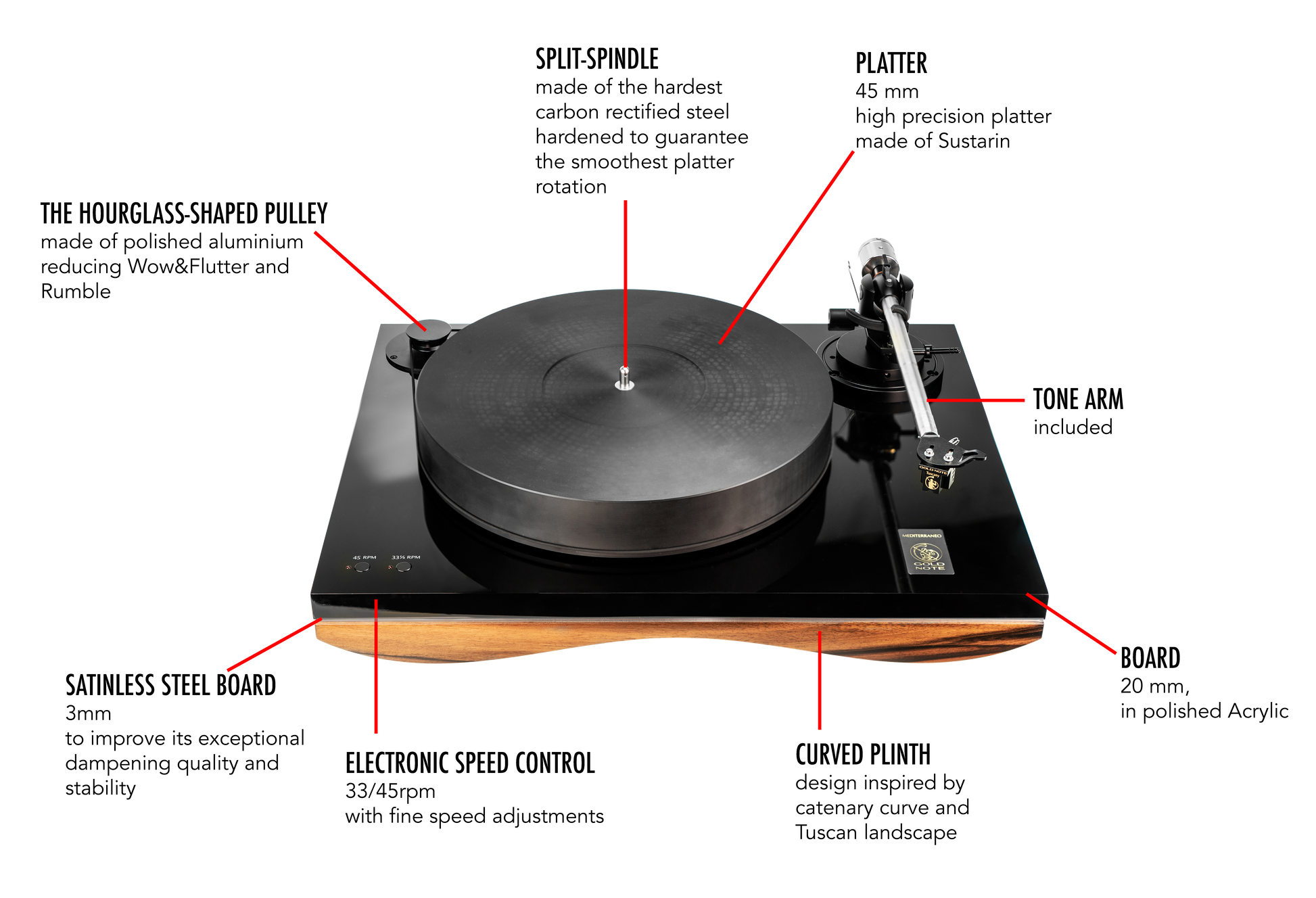 The Power Supply Unit electronically controls the 33⅓rpm and 45rpm modes as well as the fine speed adjustment, storing all settings in memory. The Mediterraneo features an 80mm long bearing/spindle design, made of the hardest rectified carbon steel to achieve perfect working fluidity. The bearing system is made of bronze guaranteeing the smoothest platter rotation.