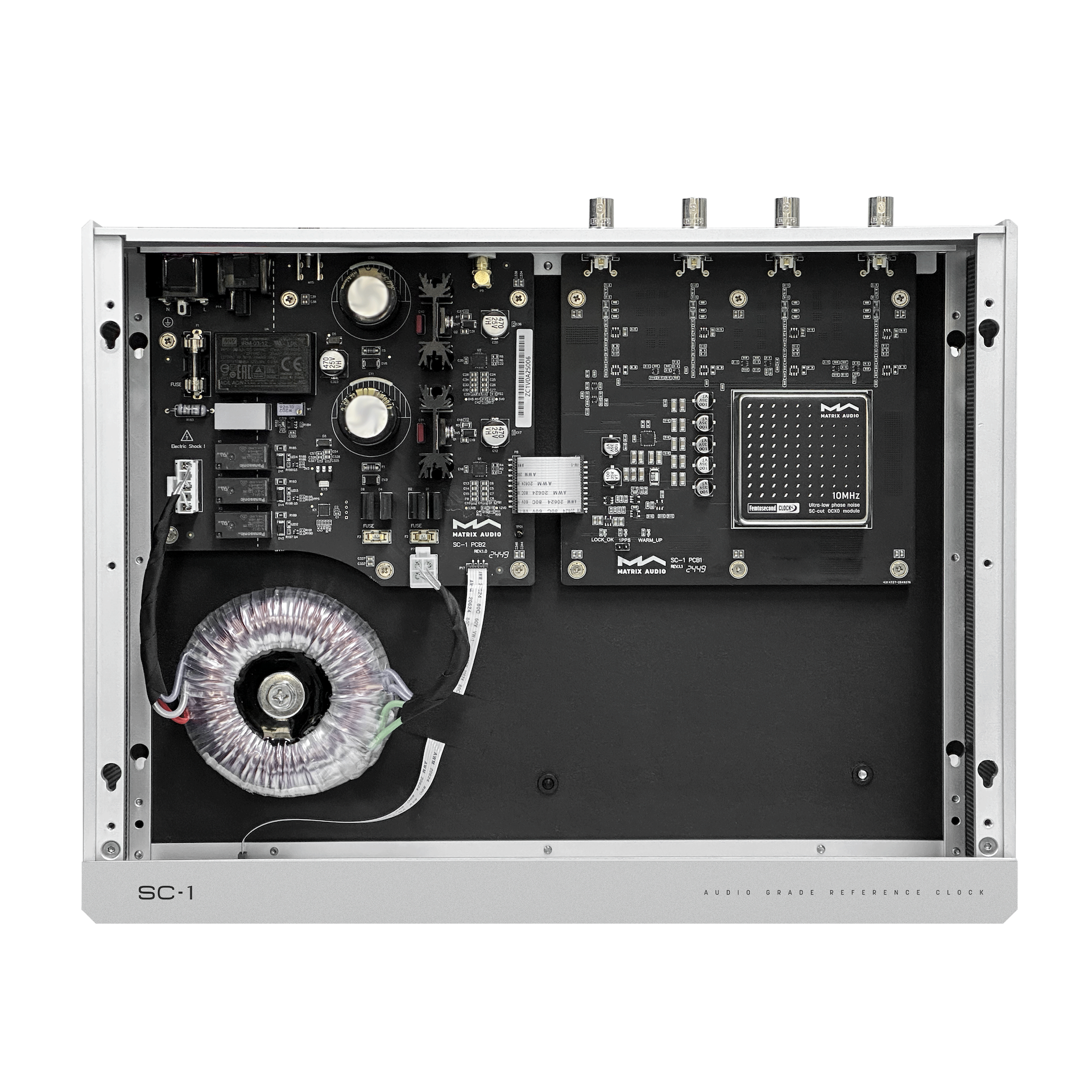 At the core of the SC-1 lies Matrix Audio's custom-made OCXO (Oven-Controlled Crystal Oscillator) module, utilizing an SC-cut crystal. Although this cutting process is highly complex, it enables the clock module with superior phase noise and aging characteristics. With precise temperature control by the oven chamber, the crystal operates in a highly stable environment, effectively minimizing the impact of ambient temperature fluctuations on phase noise and jitter.