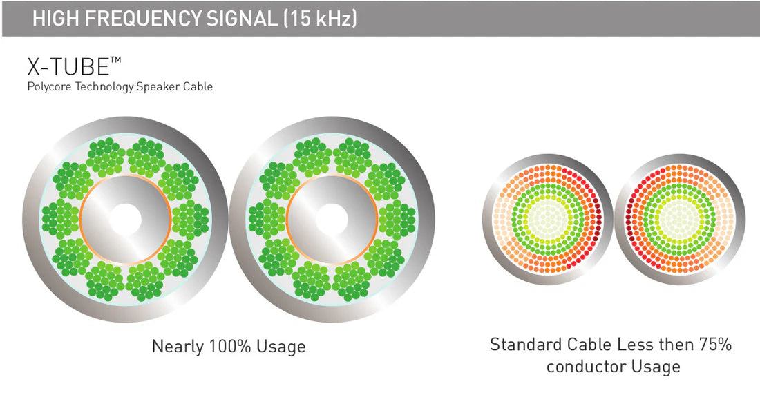 This “proximity effect” has a detrimental influence on current distribution in a speaker cable even if it utilises X-Tube™ Technology. With XT25 we tackle the proximity effect and the skin effect by combining our existing Aircore™ and X-Tube™ Technologies into a new X-Tube™ variation. By forming the conductors into a tube-like shape with a hollow centre, current densities at higher frequencies are maintained because the electric field which contributes towards the skin effect acts towards the centre of the conductor from where the conductive material has been removed. At the same time instead of using a braided structure a ring of conductors is formed into separate bundles with only a loose electrical association which are then twisted into a 90 mm lay so that no single conductor bundle remains on the inside or outside of the cable (and therefore prey to the proximity effect) for long enough for it to become an audible problem. This geometry promotes a more consistent signal distribution making for a more accurate musical reproduction.